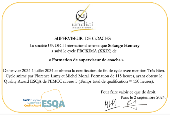 Solange est en certifiée Superviseur de coachs et autres métiers de l’accompagnement (promotion Proxima). Elle est formée par Undici International (Florence Lamy & Michel Moral). Cette formation à la supervision est, à ce jour, la seule formation en France a avoir reçu le European Supervision Quality Award de l’EMCC, l’association professionnelle européenne des coachs, mentors et superviseurs.